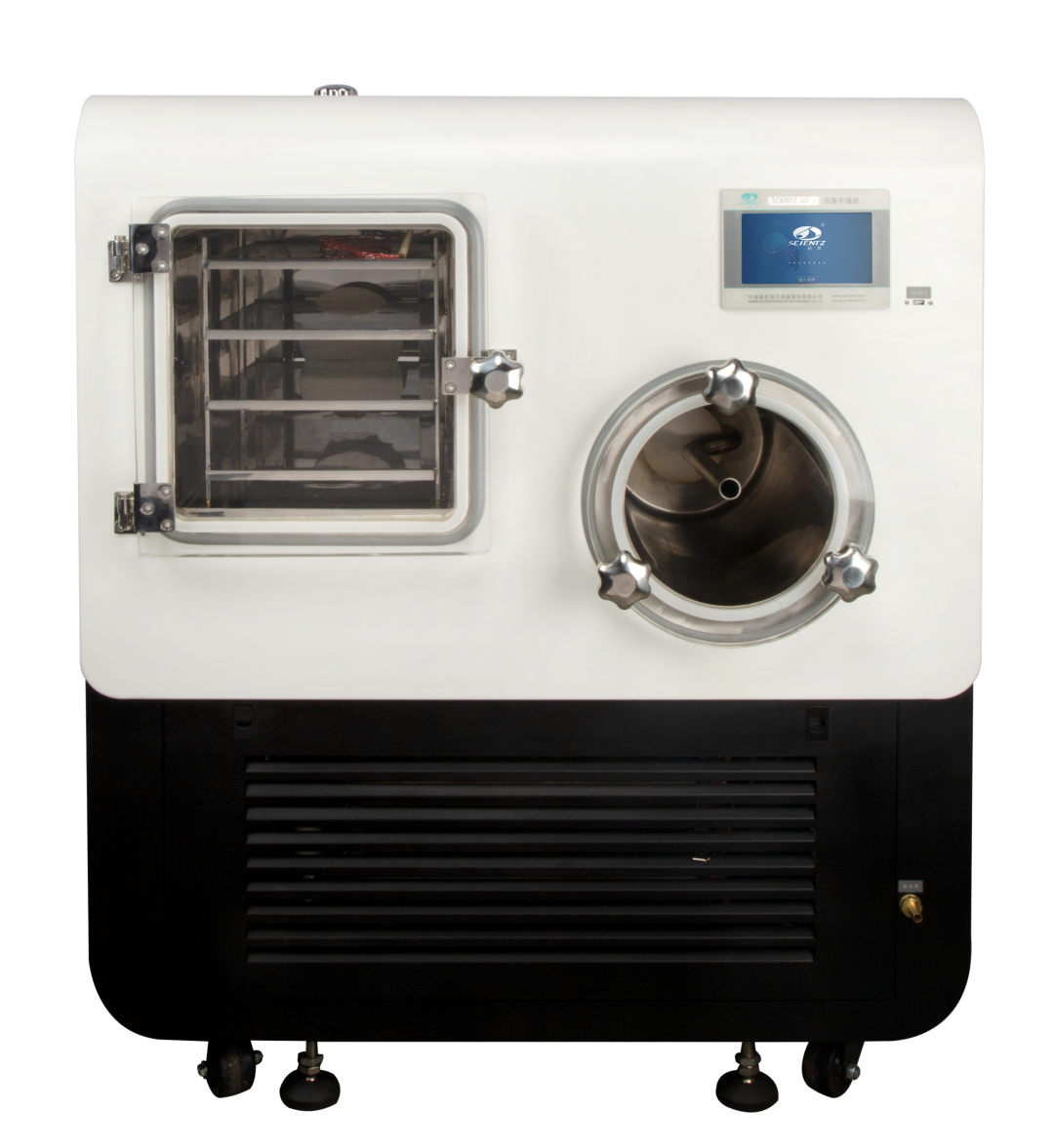 ? 干燥室采用無色透明一次注塑成型聚碳干燥室,耐腐蝕、不易碎、無粘接、透明度高、密閉性強、樣品清楚直觀,可觀察 凍干的全過程。