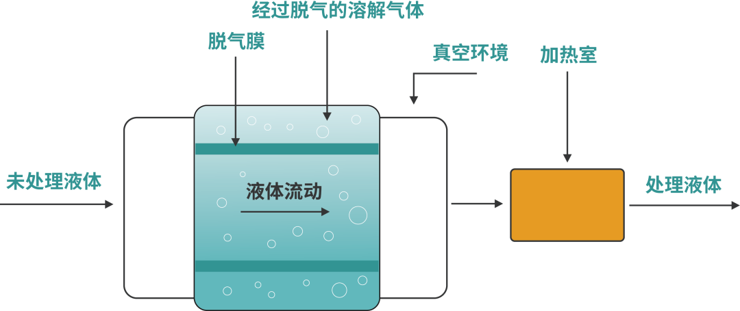 脫氣膜內裝有大量的中空纖維,水分子不能通過,而氣體分子能夠通過。工作時,在真空泵的作用下將氣體抽走,并形成一定的負壓,這樣水中的氣體就不斷經中空纖維向外溢出,然后水再經過加熱管路進行加熱處理,最后達到去除空氣的目的。